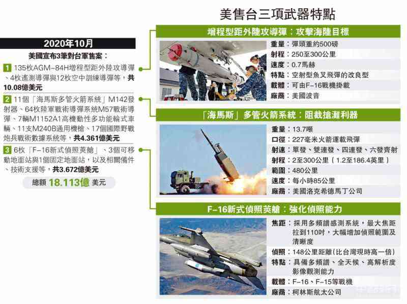 【記者蘇榕蓉】軍事專家王云飛向大公報表示,與以往美國對臺軍售最大不同的是,這次軍售以進攻性武器為主,尤其“增程型距外陸攻導(dǎo)彈”(SLAM-ER)和“高機動性多管火箭系統(tǒng)(HIMARS)”,對大陸海上活動目標和陸上目標構(gòu)成一定的威脅。
