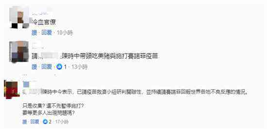 “只是收集?還不先暫停施打?要等更多人出現(xiàn)問題嗎?”島內(nèi)民眾怒斥:“冷血官僚!”“請(qǐng)陳時(shí)中帶頭吃美豬與施打賽諾菲疫苗!”“這種阿Q心態(tài),會(huì)不會(huì)太夸張了!”“叫別人(賽諾菲)回應(yīng),你自己不會(huì)去查嗎?”“新加坡:與死亡無(wú)關(guān),停用;臺(tái)灣:與死亡無(wú)關(guān),繼續(xù)!你選擇哪一個(gè)?”