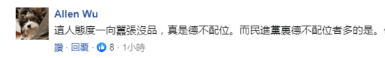 還有網(wǎng)友更犀利指出,“這人(蘇貞昌)態(tài)度一向囂張沒(méi)品,真是德不配位。而民進(jìn)黨里德不配位者多的是!”