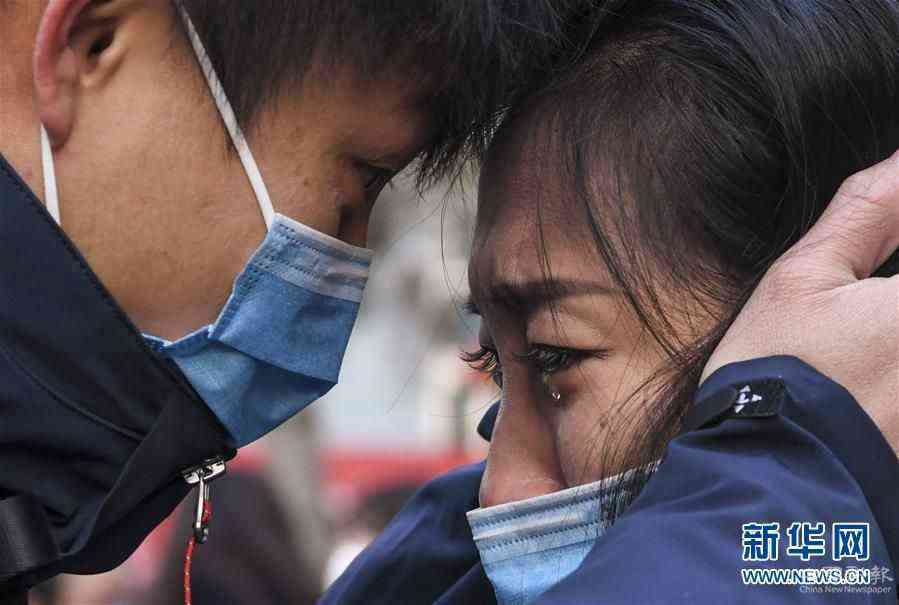 3月8日,武漢體育中心方艙醫(yī)院送走了最后61名康復(fù)的患者,正式休艙。這是來自貴州醫(yī)療隊的葉青與康復(fù)的患者分別時落淚,她試圖擦拭淚水。 新華社記者 肖藝九 攝
