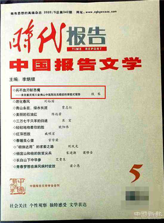 中國新報訊(記者 黃金華)5月21日,隨著《時代報告 中國報告文學(xué)》2020/5總第342期運(yùn)抵重慶,標(biāo)志著該刊重要版面刊發(fā)高級記者、原三峽都市報總編輯、國內(nèi)著名報告文學(xué)作家錢犁先生長篇報告文學(xué)作品《兵不血刃斬惡魔》出版發(fā)行,正式與讀者見面。該報告文學(xué)是目前國內(nèi)首次以報告文學(xué)形式向社會公眾全方面展示重慶南川金佛山中醫(yī)院運(yùn)用傳統(tǒng)中醫(yī)“望、聞、問、切”的診療手段,采用純中藥攻克腫瘤頑疾的長篇報告文學(xué)。