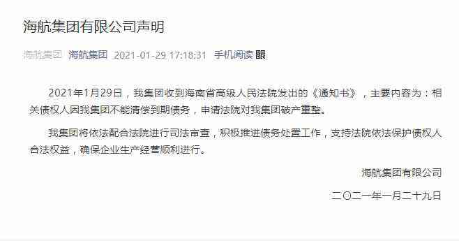 海航集團(tuán)聲明:債權(quán)人申請(qǐng)法院對(duì)我集團(tuán)破產(chǎn)重整