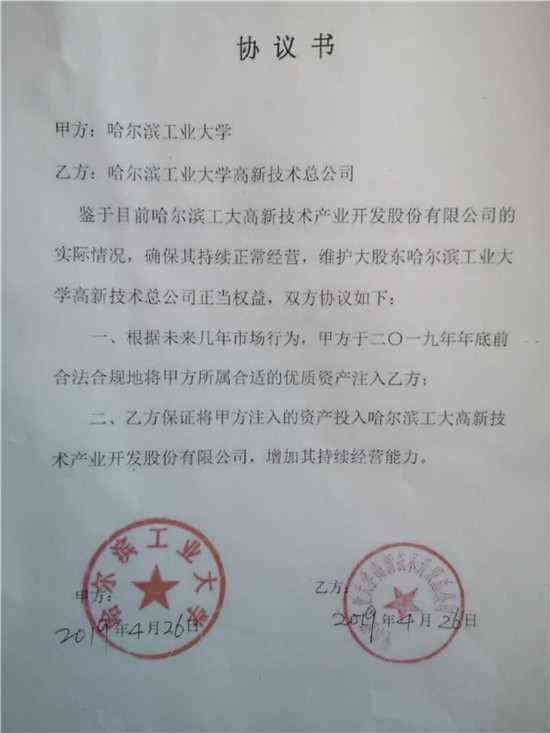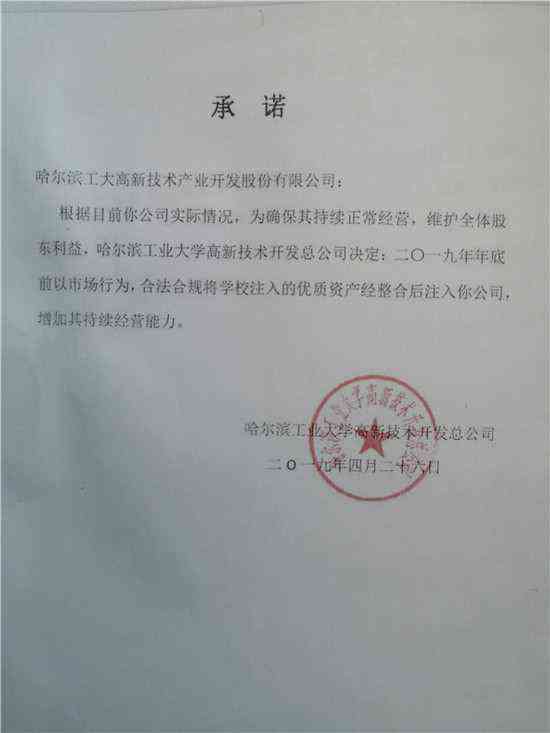2019年4月26日,哈工大作為工大高新的實(shí)際控制人,為了避免工大高新暫停退市,哈工大承諾在2019年12月31日前將哈工大所屬優(yōu)質(zhì)資產(chǎn)注入工大高新,以增強(qiáng)上市公司的持續(xù)經(jīng)營(yíng)能力,并出具了蓋有哈工大公章的協(xié)議和承諾函。投資者相信哈工大的協(xié)議和承諾書,義無(wú)反顧選擇投資,沒有想到原來是個(gè)陷阱。但截至記者發(fā)稿,哈工大并沒有兌現(xiàn)注資承諾。