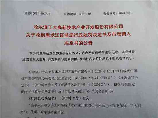 工大高新于2020年10月23日收到黑龍江證監(jiān)局《行政處罰書》(【2020】2號(hào))及《市場(chǎng)禁入決定書》(【2020】2號(hào)),查明工大高新存在多項(xiàng)違法事實(shí):未及時(shí)披露關(guān)聯(lián)方非經(jīng)營(yíng)性占用上市公司資金,未及時(shí)披露對(duì)外擔(dān)保情況,未及時(shí)披露重大訴訟和仲裁情況,未及時(shí)披露基本賬號(hào)被凍結(jié)情況,未及時(shí)披露子公司股權(quán)被凍結(jié)情況,未及時(shí)披露重大債務(wù)未清償情況,2016年、2017年年度報(bào)告披露內(nèi)容不真實(shí)、不準(zhǔn)確。