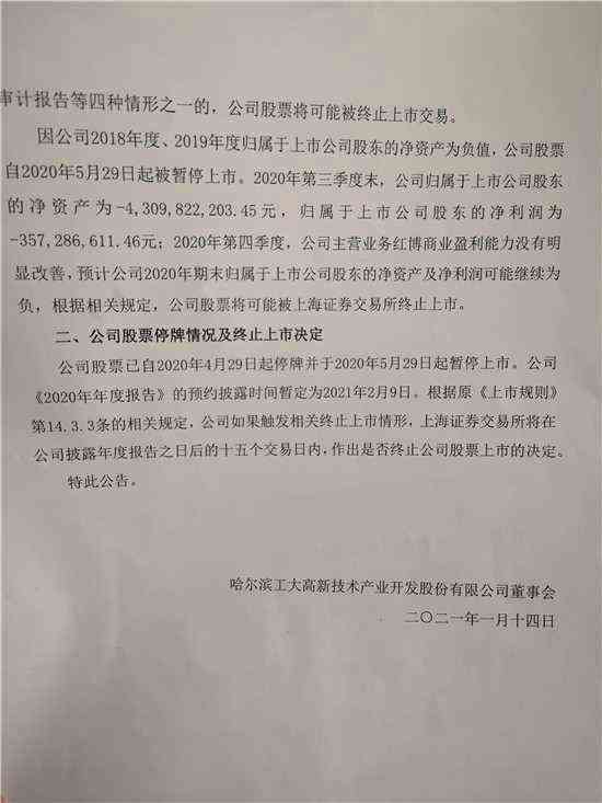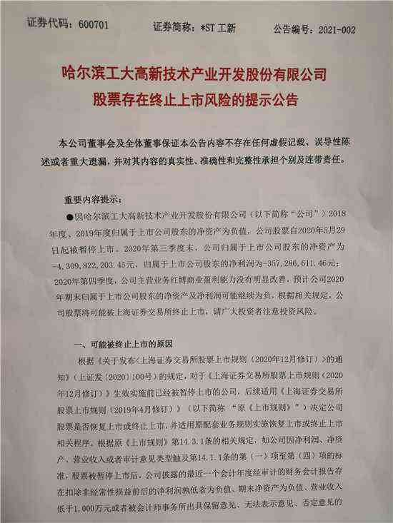 因哈爾濱工大高新技術(shù)產(chǎn)業(yè)開發(fā)股份有限公司(以下簡(jiǎn)稱“工大高新”,證劵代碼:600701,*ST工新)2017年度、2018年度、2019年度連續(xù)三年歸屬于上市公司股東的凈利潤(rùn)為負(fù),*ST工新股票自2020年5月29日起被暫停上市,2020年度繼續(xù)為虧損,根據(jù)《上海證券交易所股票上市規(guī)則》相關(guān)規(guī)定,公司股票將可能被終止上市交易。