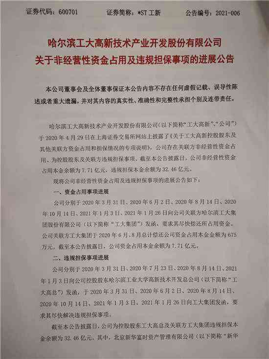 據(jù)了解,自2015年12月以來,工大高新為哈爾濱工業(yè)大學(xué)(以下簡(jiǎn)稱“哈工大”)控股的工大集團(tuán)、工大高總等公司提供違規(guī)擔(dān)保,至今還有本金32.46億元未歸還;哈工大控股公司工大集團(tuán)非經(jīng)營(yíng)性占用工大高新資金,至今還有本金7.71億未歸還。