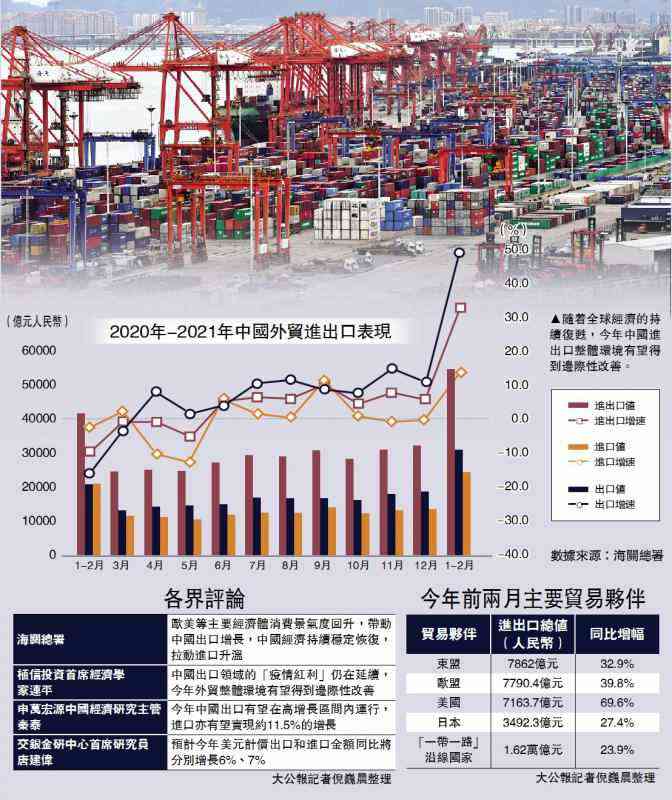 中國外貿(mào)進出口數(shù)據(jù)迎來“開門紅”。海關(guān)總署昨日公布,今年前兩個月,中國進出口總值8344.9億美元,同比增41.2%。其中,出口4688.7億美元,增長60.6%,為歷史最高增速;進口3656.2億美元,增長22.2%;貿(mào)易順差1032.5億美元,而去年同期為72.1億美元逆差。受訪專家相信,隨著全球經(jīng)濟的持續(xù)復(fù)甦,今年中國進出口整體環(huán)境有望得到邊際性改善。\大公報記者 倪巍晨上海報道