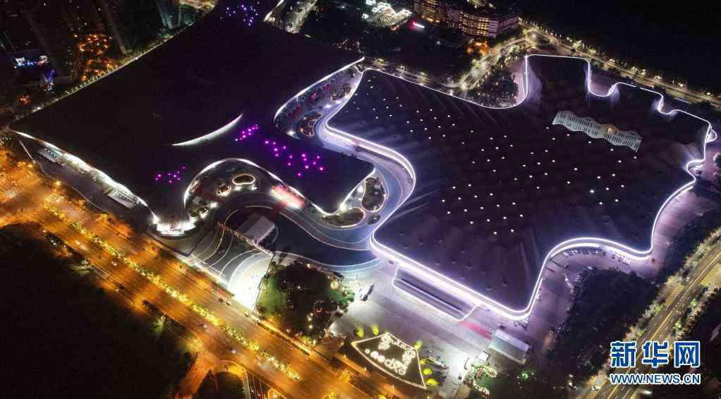 夜色下的首屆消博會(huì)舉辦地海南國(guó)際會(huì)展中心(無(wú)人機(jī)照片,5月4日攝)。新華社記者 楊冠宇 攝