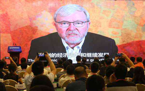 澳大利亞前總理、美國亞洲協(xié)會會長陸克文在開幕式上發(fā)表視頻致辭。(中國日報記者 鄒紅 攝)