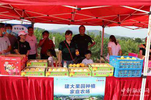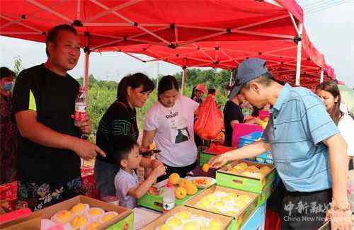 2021年7月24日,在安徽省廬江縣冶父山鎮(zhèn)明圣村舉辦的首屆黃桃采摘文化旅游節(jié)上,游客正在品嘗、購買黃桃。