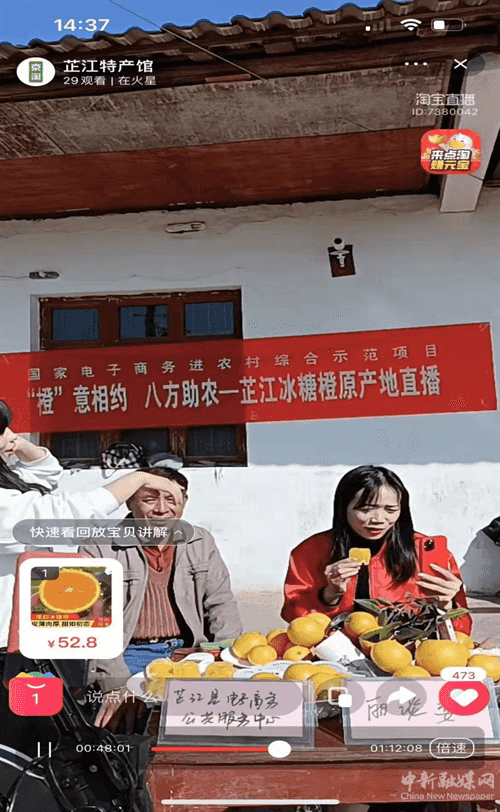 “歡迎直播間的朋友們,芷江冰糖橙,甜蜜多汁的橙子,就像在糖水里泡大的果子般甜蜜,用力咬上一口,爽脆的果肉帶著四溢的果汁,吃起來(lái)口感豐富、酸甜爽口、脆嫩化渣、甜而不膩、果香醇厚、縈繞唇齒,深受消費(fèi)者喜愛(ài)。大家快來(lái)下單吆!”日前,湖南芷江侗族自治縣國(guó)家電子商務(wù)進(jìn)農(nóng)村綜合示范承運(yùn)服務(wù)商山西熔熠文化傳播有限公司聯(lián)動(dòng)冰糖橙種植大戶開(kāi)展“橙心橙意助農(nóng)增收”直播帶貨活動(dòng),拓寬冰糖橙銷售渠道,帶動(dòng)柑橘產(chǎn)業(yè)持續(xù)發(fā)展,走出了一條“互聯(lián)網(wǎng)+電商”的村美、民富、產(chǎn)業(yè)旺新路子。