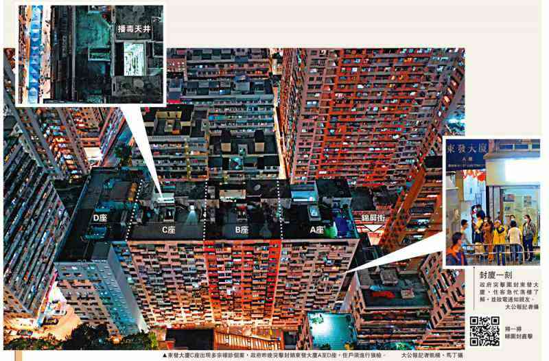 圖:東發(fā)大廈C座出現(xiàn)多宗確診個案,政府昨晚突擊封鎖東發(fā)大廈A至D座,住戶須進行強檢。\大公報記者凱楊、馬丁攝