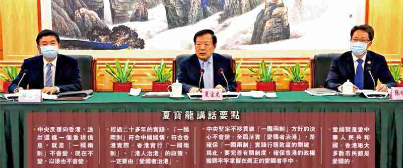 全國政協(xié)副主席、國務(wù)院港澳事務(wù)辦公室主任夏寶龍?jiān)跁媳硎荆醒雸?jiān)定不移貫徹“一國兩制”方針的決心不會變。全面落實(shí)“愛國者治港”,是確保“一國兩制”實(shí)踐行穩(wěn)致遠(yuǎn)的關(guān)鍵。為此,要完善有關(guān)制度,確保香港的政權(quán)機(jī)關(guān)牢牢掌握在真正的愛國者手中。愛國就是愛中華人民共和國。香港絕大多數(shù)市民都是愛國的。中央有關(guān)部門會繼續(xù)聽取香港各界人士關(guān)于進(jìn)一步完善有關(guān)制度的意見建議。