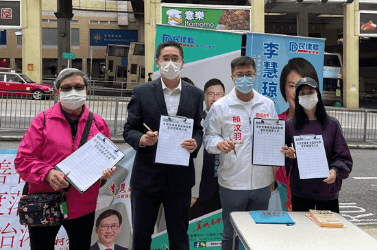 香港特區(qū)政府商務(wù)及經(jīng)濟(jì)發(fā)展局副局長陳百里(左二)、民建聯(lián)副秘書長顏汶羽(右二)等到黃大仙參與街站簽名活動,支持完善香港選舉制度。 (中新社)
