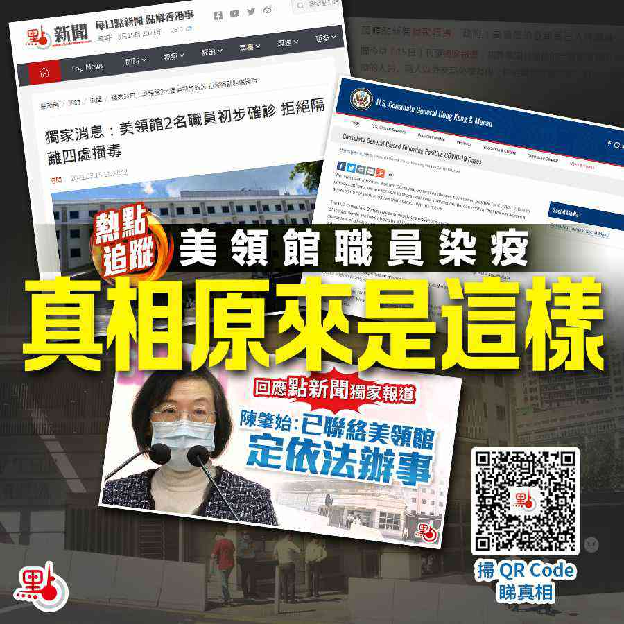 當(dāng)晚23:29,點(diǎn)新聞就事件發(fā)出第四篇報(bào)道,標(biāo)題為《回應(yīng)點(diǎn)新聞獨(dú)家報(bào)道 政府:美領(lǐng)館染疫職員已入院隔離》,報(bào)道了政府已按既定程序跟進(jìn),兩名美領(lǐng)館人員已經(jīng)入院隔離和治療,并要求美領(lǐng)館工作人員及訪客按法例進(jìn)行檢測(cè)。