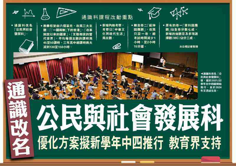 新高中通識(shí)科改名揭盅,課程發(fā)展議會(huì)宣布,學(xué)科將改名為“公民與社會(huì)發(fā)展科”。今年2月,教育局曾公布該科目的優(yōu)化方案,除了列出六個(gè)備選名稱(chēng),還將原先的六個(gè)單元縮減為三大主題、維持必修必考等。議會(huì)昨日表示,期望教育局讓優(yōu)化方案于2021/22學(xué)年在中四級(jí)開(kāi)始推行,會(huì)議上亦通過(guò)在2021/22學(xué)年中四開(kāi)始停止開(kāi)設(shè)組合科學(xué)和綜合科學(xué)科的方案。