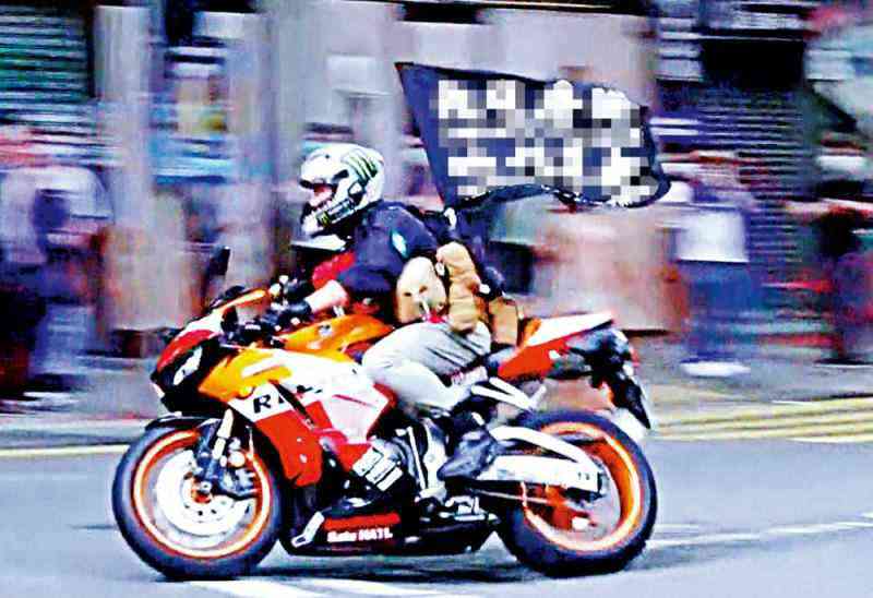 圖:唐英杰在去年7月1日,駕駛插上“港獨(dú)”旗幟電單車,加速至?xí)r速60公里,沖越警方防線,令三名警員嚴(yán)重受傷。