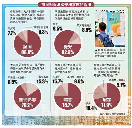 調(diào)查顯示,六成市民表示國安法無損個人權(quán)利和自由,六成三市民認(rèn)為國安法的實施無損香港營商環(huán)境,有超過五成市民支持下屆特區(qū)政府就基本法第23條完成本地立法。