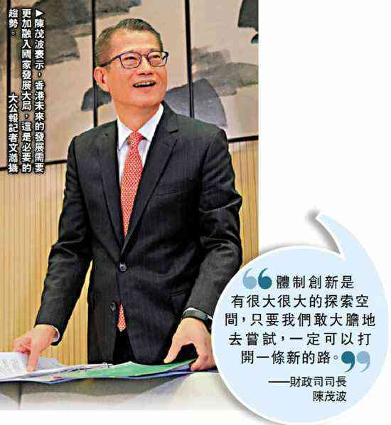 國家“十四五”規(guī)劃下,香港正迎來前所未有的新發(fā)展機(jī)遇。財政司司長陳茂波昨日接受大公報記者訪問時以面向“藍(lán)海”來形容,指出未來香港需要在政策創(chuàng)新和制度創(chuàng)新上多做思考,以己所長服務(wù)國家所需,融入大灣區(qū),共謀發(fā)展,“只要大膽嘗試,一定可以打開一條新路。”他鼓勵港青要有大視野和胸懷,到大灣區(qū)內(nèi)地城市探索發(fā)展,享受政策紅利。