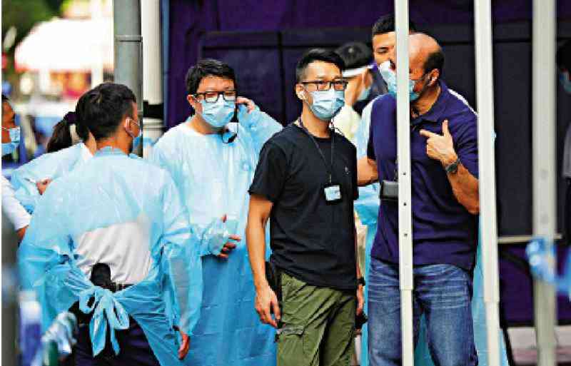圖:澳門新增兩宗確診個(gè)案,昨日下午至周二下午,進(jìn)行為期三日全民檢測。圖為澳門防疫人員在確診者居住大廈附近工作。\新華社
