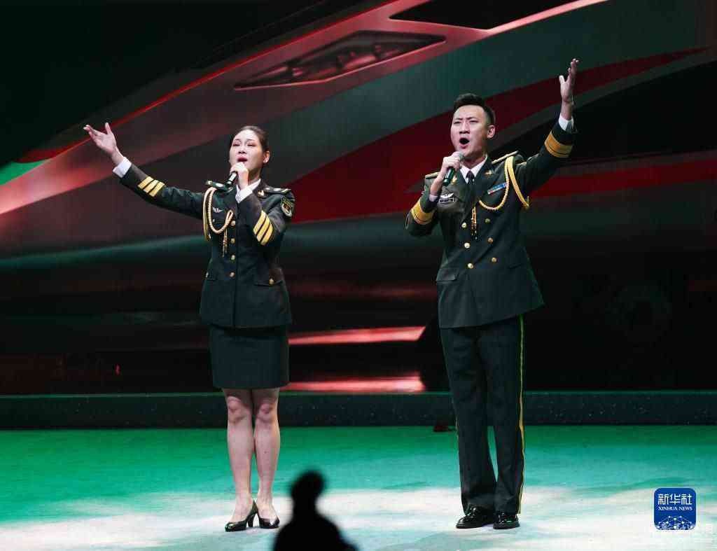 10月1日,在紅磡香港體育館,中國(guó)人民解放軍駐香港部隊(duì)文工團(tuán)演員在演唱歌曲。新華社記者 王申 攝