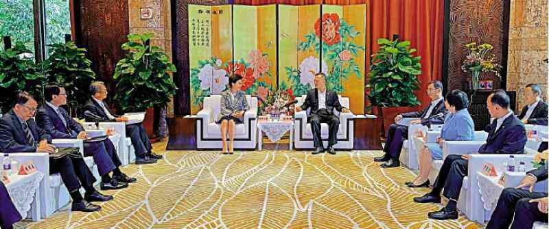 圖:行政長官林鄭月娥昨日在廣州與廣州市委書記張碩輔會面。財(cái)政司司長陳茂波、商務(wù)及經(jīng)濟(jì)發(fā)展局局長邱騰華和行政長官辦公室主任陳國基亦有出席。