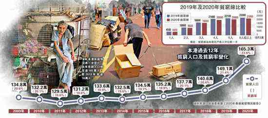新冠疫情重創(chuàng)本港經(jīng)濟,令貧窮情況進一步惡化。去年貧窮人口增至165.3萬人,較2019年多16.2萬人,貧窮率由前年的21.4%升至23.6%,即大約每四個人有一個貧窮,創(chuàng)下有紀錄以來的12年新高。政府去年全民派一萬元及推出防疫抗疫基金,總額3000億元,連同其他恒常支援政策,令貧窮率降至7.9%,貧窮人數(shù)仍有55.4萬人。
