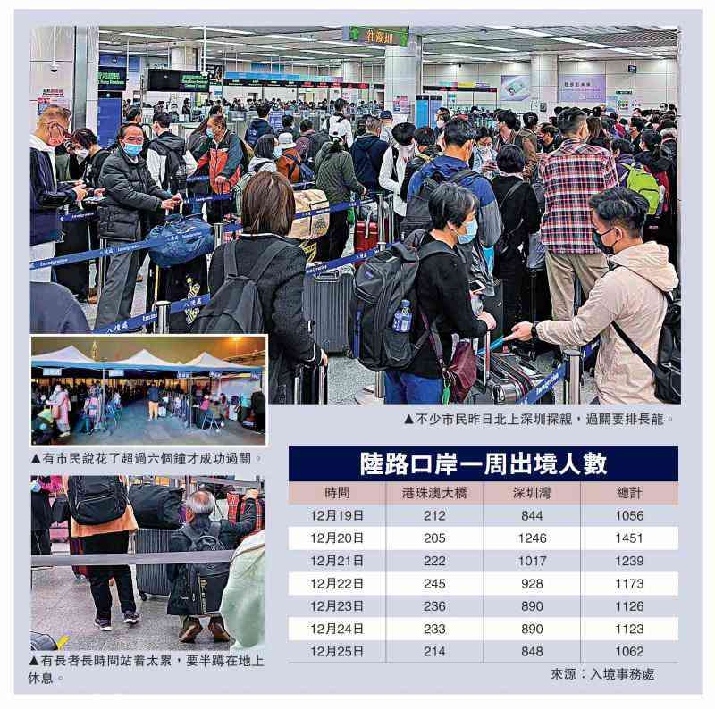 為趕及新春前能回鄉(xiāng)與親友過(guò)節(jié),大批港人近日提前北上,好預(yù)時(shí)間隔離。深圳灣口岸昨日又見(jiàn)排長(zhǎng)龍,人潮一度由深圳倒灌至香港。有市民輪候六個(gè)小時(shí)才成功過(guò)關(guān),由出發(fā)到入住檢疫酒店歷時(shí)逾11小時(shí)。有人大嘆天氣冷,寒風(fēng)下小朋友和老人家更難捱,慨嘆“返鄉(xiāng)之路太不容易!”