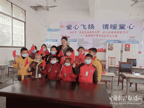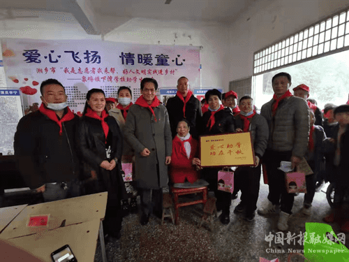湘鄉(xiāng)市酒業(yè)協(xié)會愛心人士與“板凳媽媽”許月華、李寧老師等合影