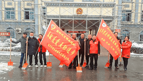 當天天寒地凍,在清雪現(xiàn)場,志愿者們攜帶鐵鍬、掃帚等清掃工具,深入鎮(zhèn)集市、街道清除積雪積冰,志愿者在冰天雪地中形成了一道亮麗的風景線。