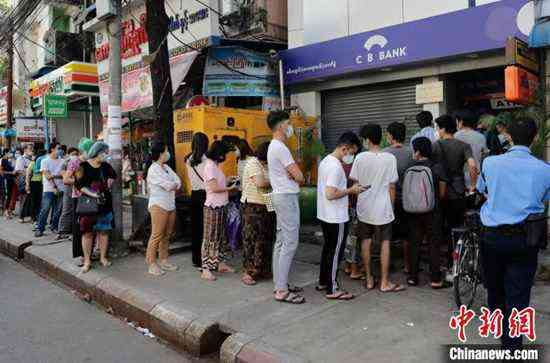 在仰光街頭,記者看到多家銀行的ATM機(jī)前民眾紛紛排起長(zhǎng)隊(duì)提款。