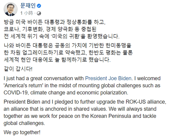 韓美兩國領(lǐng)導(dǎo)人首次正式通話。(文在寅FB)