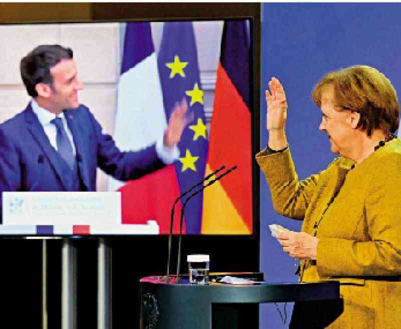 圖:默克爾(右)上月與馬克龍舉行視像會議。/法新社