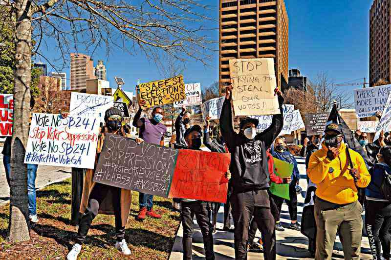 圖:示威者3月3日在佐治亞州議會外反對新選舉法案。\法新社
