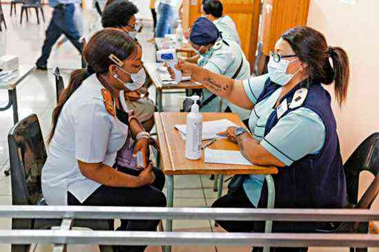 圖:南非民眾2月18日在接種新冠疫苗前測體溫。/法新社