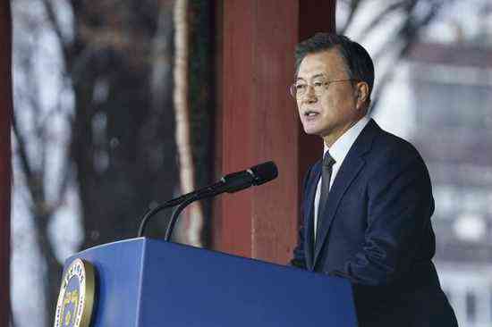 3月1日,韓國總統(tǒng)文在寅在首爾塔谷公園發(fā)表講話。(新華社)