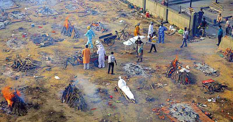 圖:印度新德里火葬場人員21日在地面焚燒新冠患者遺體。\美聯(lián)社