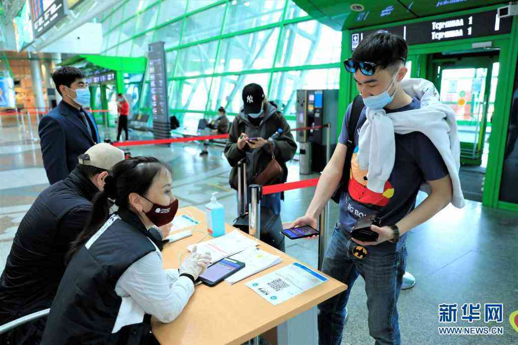 5月13日,在位于哈薩克斯坦首都努爾蘇丹的納扎爾巴耶夫機(jī)場,市民掃描健康碼識別健康狀況。