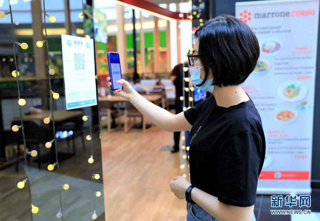 5月13日,哈薩克斯坦首都努爾蘇丹市民在一家餐廳門口掃描健康碼識別健康狀況。