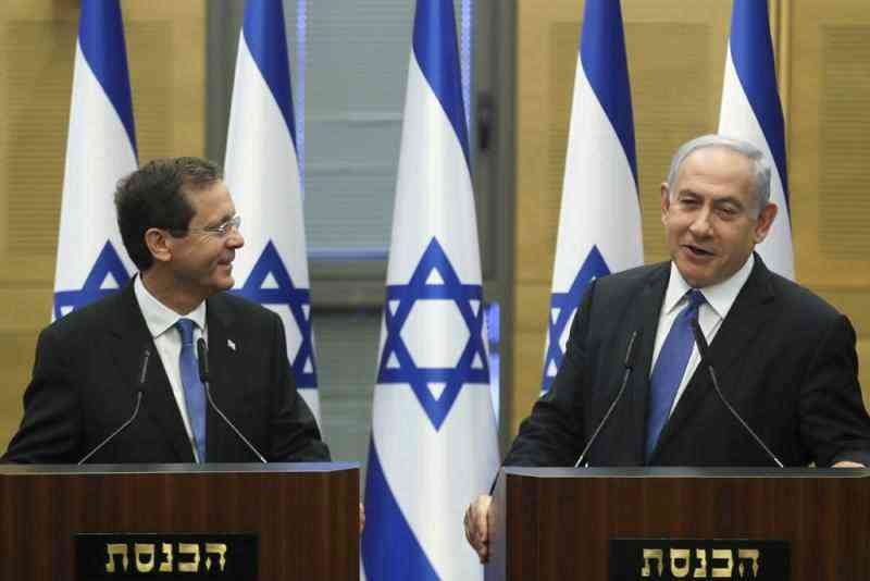 圖:以色列總理內(nèi)塔尼亞胡(右)2日與新任總統(tǒng)赫爾佐克見記者。\美聯(lián)社