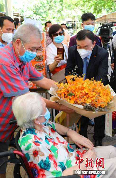 當(dāng)?shù)貢r(shí)間7月2日,中國(guó)駐柬使館一行赴金邊疫苗接種現(xiàn)場(chǎng),看望接種第二劑中國(guó)產(chǎn)新冠疫苗的101歲華裔老人賀琴女士。圖為賀琴女士與中柬相關(guān)代表合影。中新社記者 歐陽(yáng)開(kāi)宇 攝