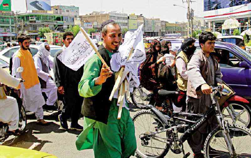 圖:塔利班兵不血刃占領(lǐng)阿富汗多地。圖為一名男子14日在赫拉特售賣塔利班旗幟。\美聯(lián)社