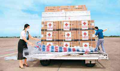 10月13日,中國政府援助老撾第六批100萬劑新冠疫苗抵達老撾首都萬象瓦岱國際機場。中國駐老撾大使姜再冬向老撾人民革命黨中央政治局委員、政府副總理吉喬移交疫苗。圖為工作人員卸載并裝運疫苗物資。