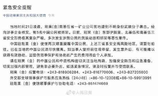 中國駐剛果金使館發(fā)緊急安全提醒據(jù)中國駐剛果(金)大使館,當(dāng)?shù)貢r間21日凌晨,剛果(金)南基伍省一礦業(yè)公司營地遭到不明身份武裝分子襲擊。經(jīng)向涉事企業(yè)核實,有5名中國公民被綁架。目前,剛果(金)東部伊圖里、北基伍和南基伍三省安全形勢極其復(fù)雜嚴(yán)峻,多次發(fā)生涉我公民的武裝劫掠和綁架等惡性案件。中國駐剛果(金)使館再次鄭重提醒中國公民,上述三省系安全高風(fēng)險地區(qū),請暫勿前往。已在當(dāng)?shù)氐闹袊裾埍M快撤離。