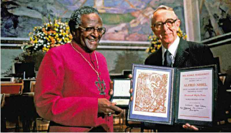 圖:南非榮休大主教圖圖(左)1984年獲得諾貝爾和平獎(jiǎng)。/法新社