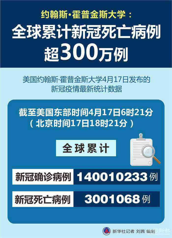 新華社紐約4月17日電 據(jù)美國(guó)約翰斯·霍普金斯大學(xué)17日發(fā)布的新冠疫情最新統(tǒng)計(jì)數(shù)據(jù),截至美國(guó)東部時(shí)間17日6時(shí)21分(北京時(shí)間17日18時(shí)21分),全球累計(jì)新冠死亡病例超過300萬例,達(dá)3001068例。