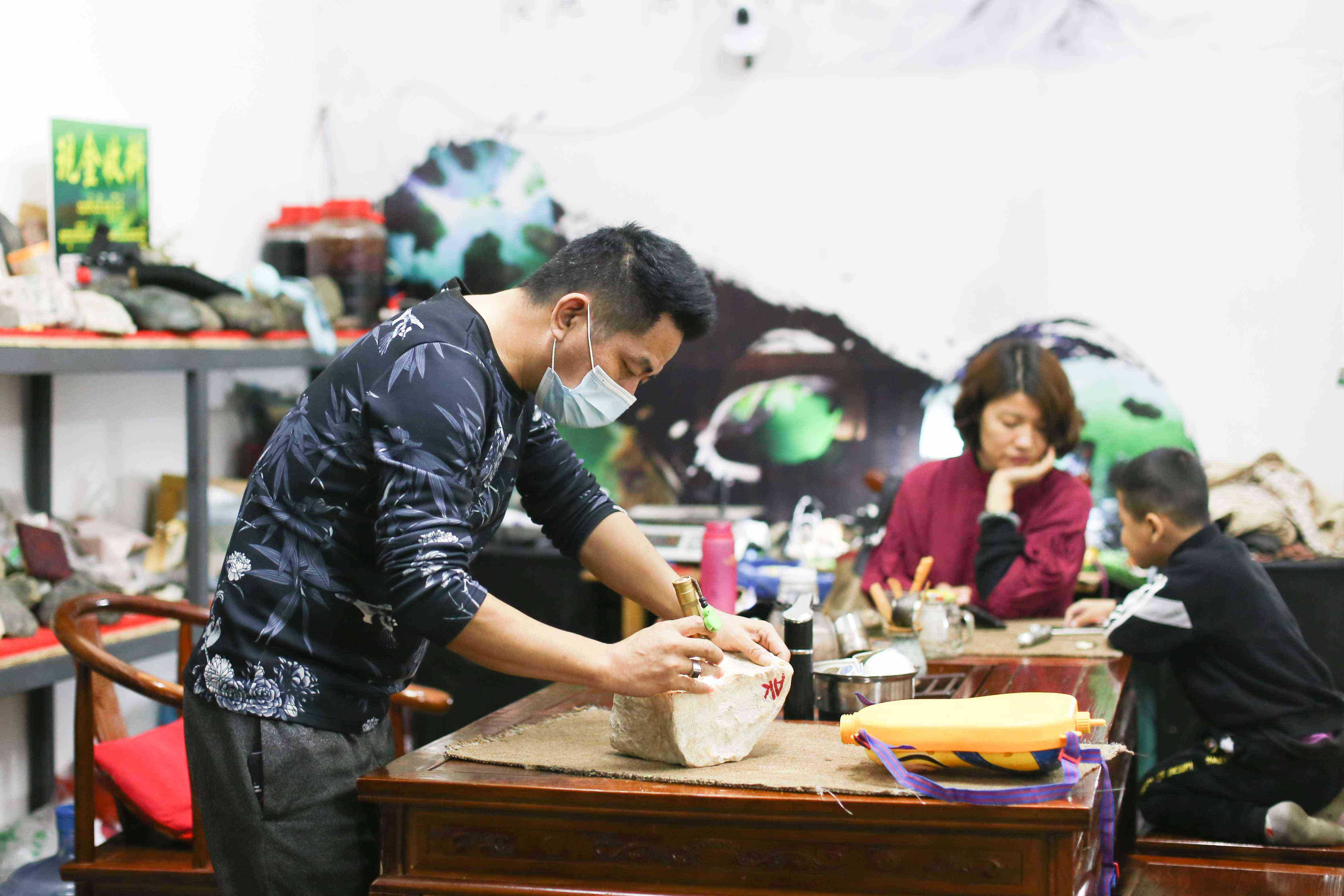 蒲志文,47歲,四川攀枝花人,經(jīng)營一家翡翠店,妻子在一旁輔導(dǎo)孩子上網(wǎng)課,“我1991年就來瑞麗了,也30年了,所以積累了不少老客戶,還可以勉強支撐。” (2021年11月16日攝)