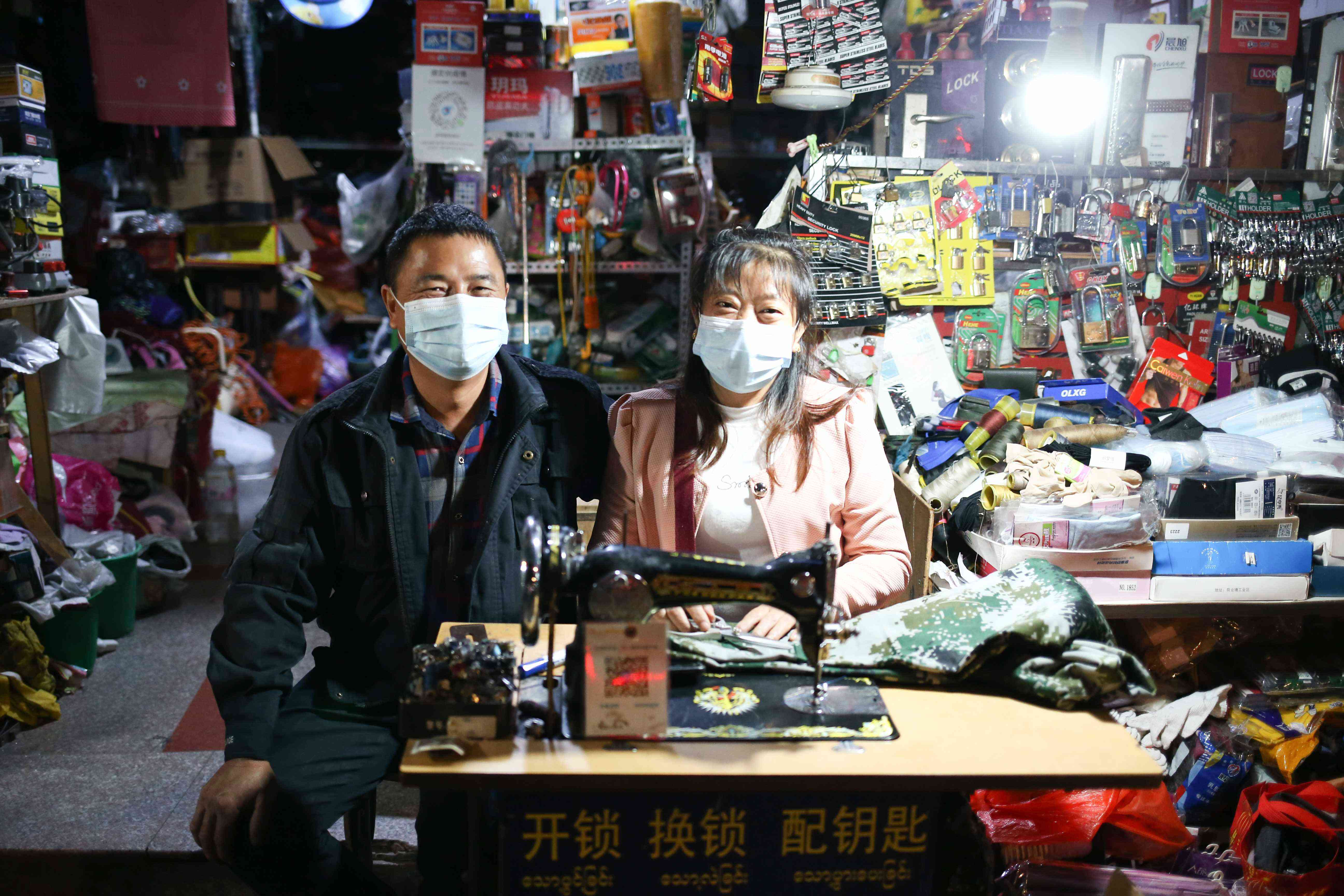 50歲的皮明國(左)和46歲的妻子麻玉梅,重慶忠縣人,90年代來到瑞麗,經(jīng)營鎖具店20多年,今年店面因疫情曾關(guān)閉3個月,“我們的兩個孩子在這里出生,現(xiàn)在都參加工作了。老人還在老家,希望疫情緩和下來今年能回去過年。”(2021年11月18日攝)