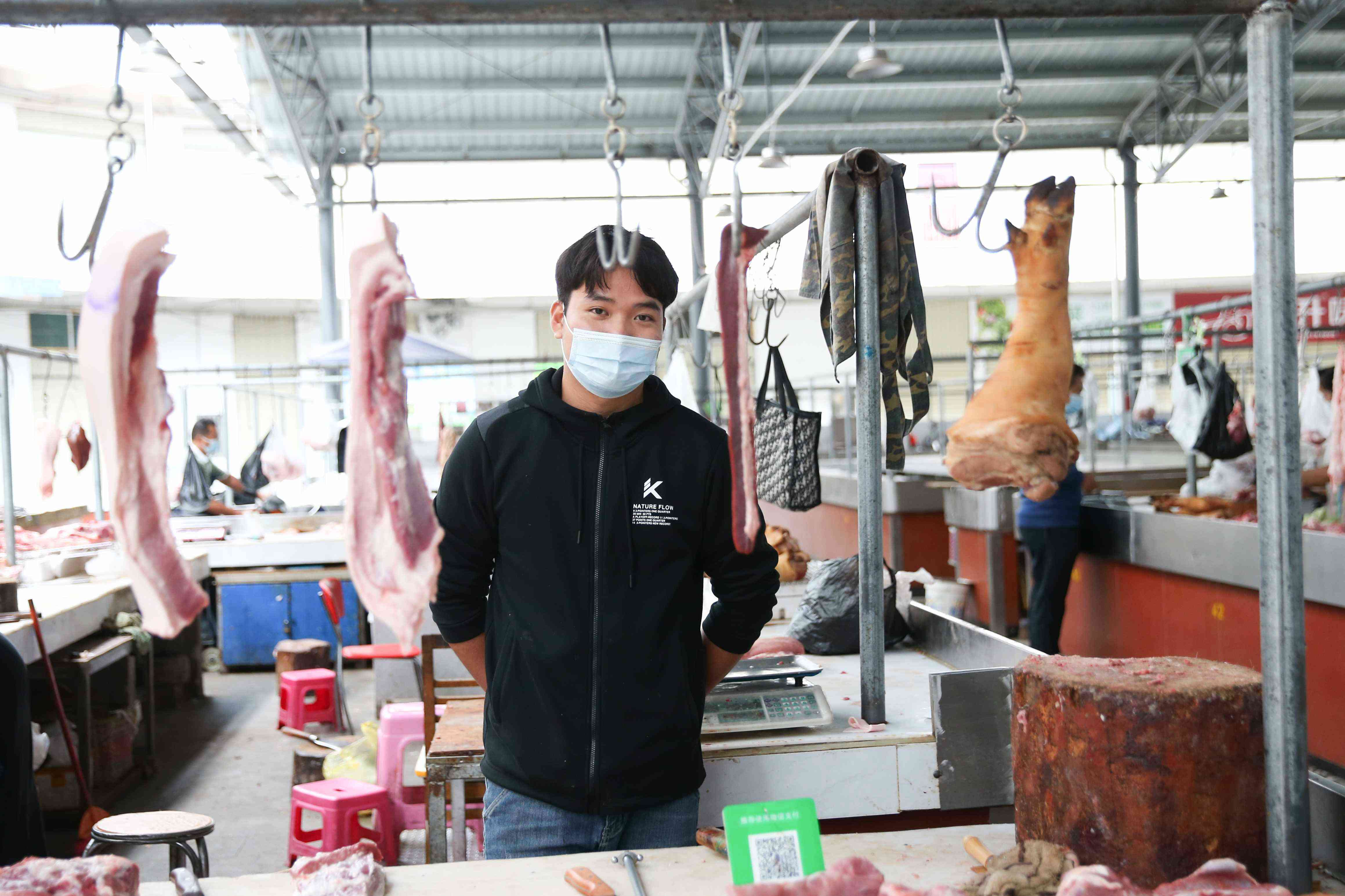 陳觀賢,23歲,廣東湛江人,在瑞麗市綜合農(nóng)貿(mào)市場經(jīng)營豬肉攤。陳觀賢此前在廣州務(wù)工,7月到瑞麗后這里出現(xiàn)疫情,生意受到很大影響,“我還是想繼續(xù)在這里做生意,我爸爸很早來這邊,我也是在這里長大的。”(2021年11月17日攝)