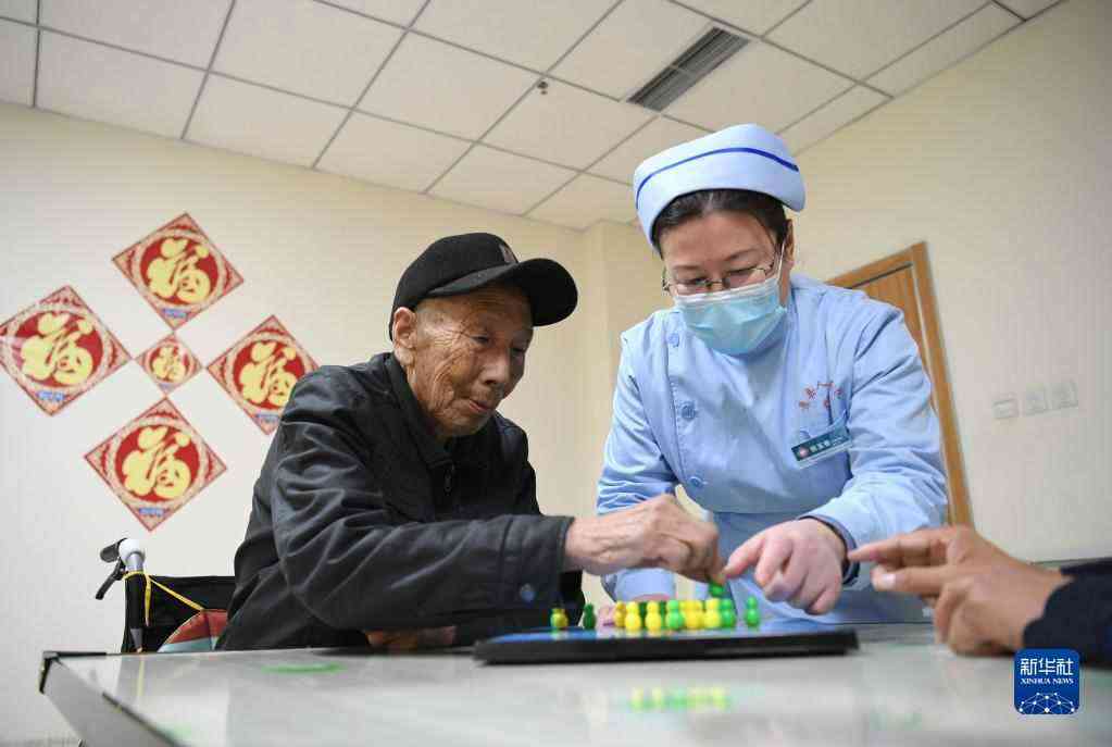 12月28日,河北省景縣人民醫(yī)院醫(yī)養(yǎng)中心工作人員陪老人下棋。